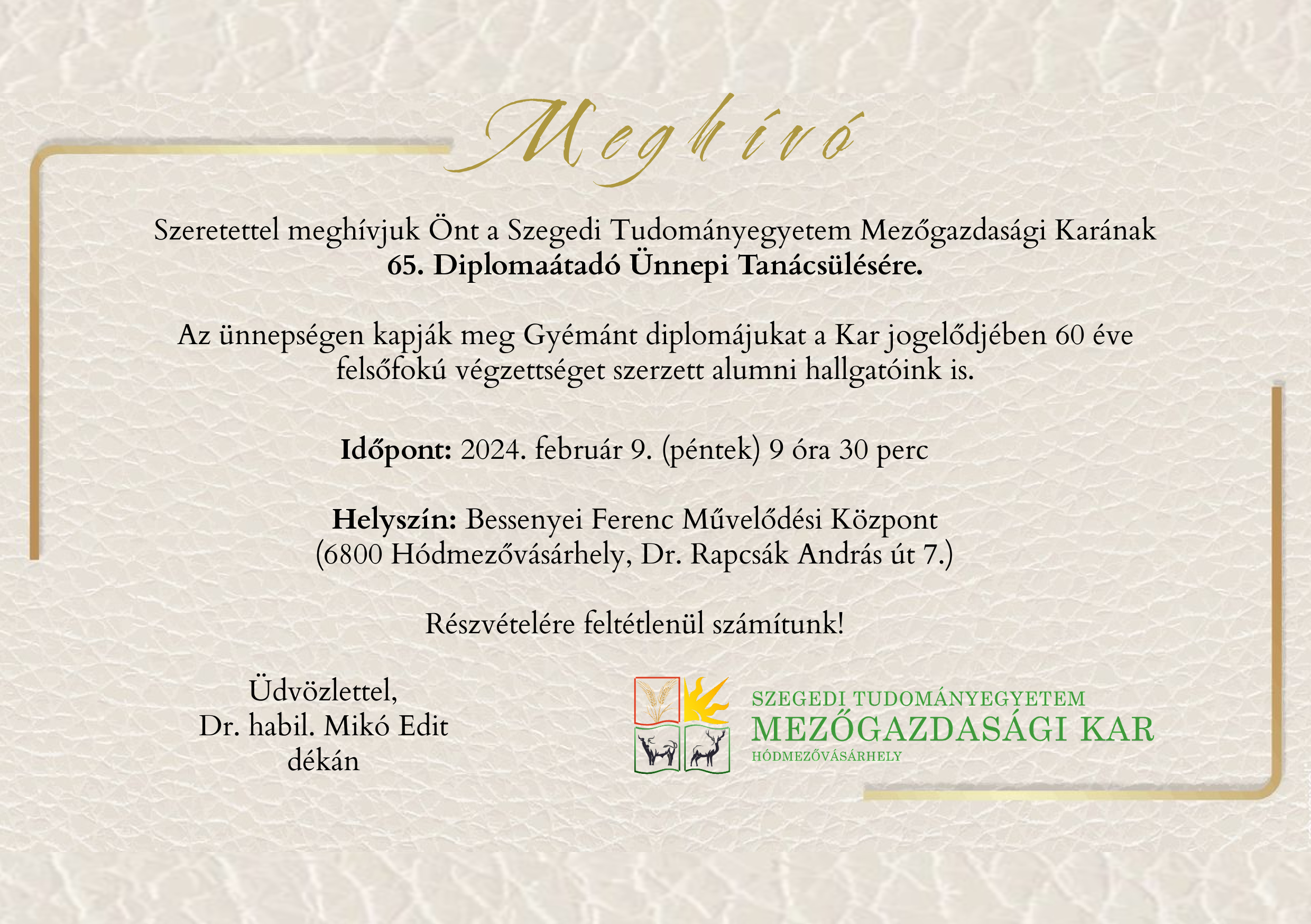 A Szegedi Tudományegyetem Mezőgazdasági Kara tisztelettel meghívja Önt a 65. Diplomaátadó Ünnepi Tanácsülésre.