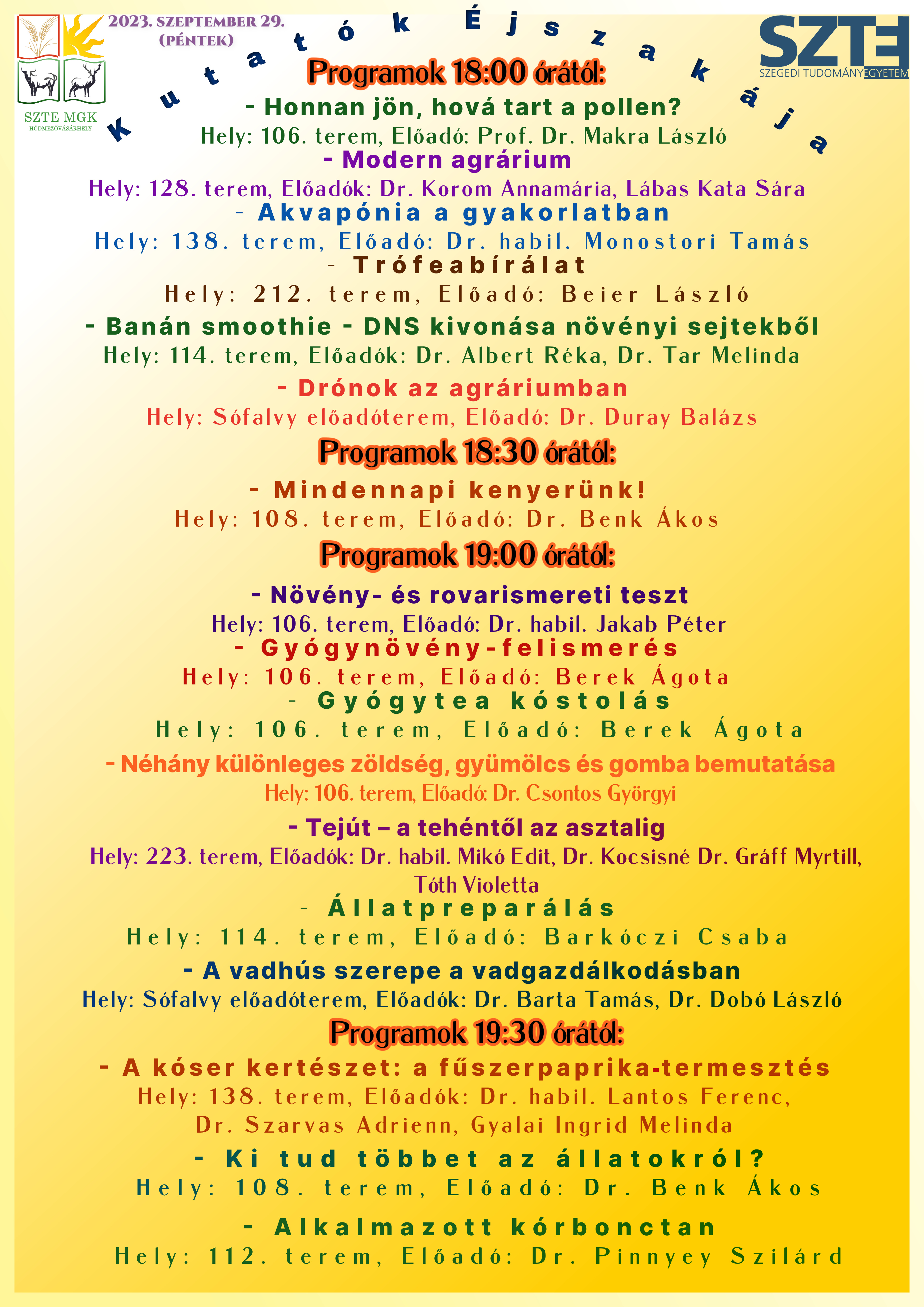 Valamennyi korosztály számára érdekes programokat ígér az SZTE Mezőgazdasági Kar az idei Kutatók Éjszakáján. A vadhús szerepe a vadgazdálkodásban című előadáson, a vadfeldolgozás bemutatása, a vadhús előkészítése, valamint a vadhús tartósítása kerül majd előtérbe. A Banán smoothie - DNS kivonása növényi sejtekből című programon egyszerű eljárással vonhatnak ki a banánból DNS-t a látogatók. Az érdeklődők bepillantást nyerhetnek a Drónok világába az agráriumban, vagy akár az Állatpreparáláson is új ismereteket szerezhetnek. Idén sem marad el a Trófeabírálat, a Tejút – a tehéntől az asztalig című népszerű program, az Alkalmazott kórbonctan, a Gyógynövény-felismerés, vagy a Gyógytea kóstolás. Ki tud többet az állatokról? címmel játékos formában ismerhetik meg a legkisebbek a haszon- és egyéb állatok legfontosabb tulajdonságait, de akár kenyeret is süthetnek a látogatók a családnak a Mindennapi kenyerünk című állomáson. A többi között az érdeklődők nyomon követhetik, hogy Honnan jön, hová tart a pollen, és a különleges növényekről és rovarokról is számos érdekességgel lehetnek gazdagabbak a Növény- és rovarismereti teszt elnevezésű állomáson. A Modern agrárium, A kóser kertészet: a fűszerpaprika-termesztés illetve Néhány különleges zöldség, gyümölcs és gomba bemutatása is fontos szerepet fog kapni az SZTE Mezőgazdasági Kar 2023-as Kutatók Éjszakájának programjában. Újdonságként jelentkezük az Akvapónia a gyakorlatban című állomással is, ahol az érdeklődők előadás keretében ismerhetik meg az akvapónia működési elvét, a halak és növények telepítésének szabályait, majd megtekinthetik az intézményben működő akvapóniás rendszert.